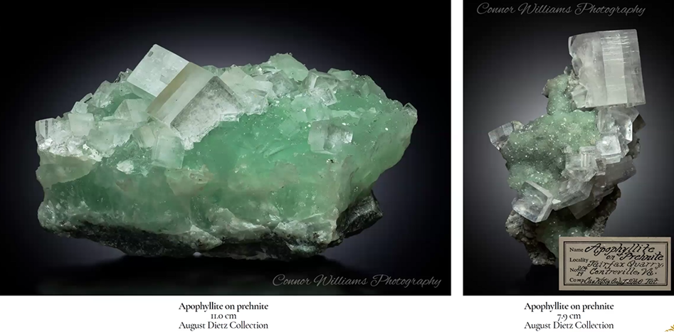 Below are examples of prehnite, a mineral commonly collected from Virginia quarries west of DC. Tom noted that he and fellow collectors, as part of the Virginia Mineral Project which Laura cited in her introduction of Tom, worked to document possible differences in the age of the prehnite specimens.