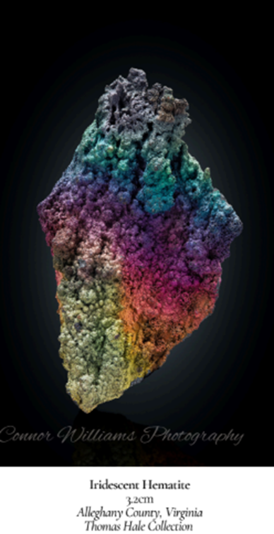 Along with his many beautiful slides, Tom also shared what he liked about several specific collecting sites and their current physical context. For example, the iridescent hematite shown below, before it came into Tom’s collection, was discovered near a fire-break pathway that James Mason University geology professor Dr. Lance Kearns explored. Some collectors reported this type of colorful hematite specimen came from a small cave. Tom, however, suggested the site was more like a narrow crack in a rock formation which the State of Virginia, for unknown reasons, subsequently sealed resulting in the area now being closed to collectors.