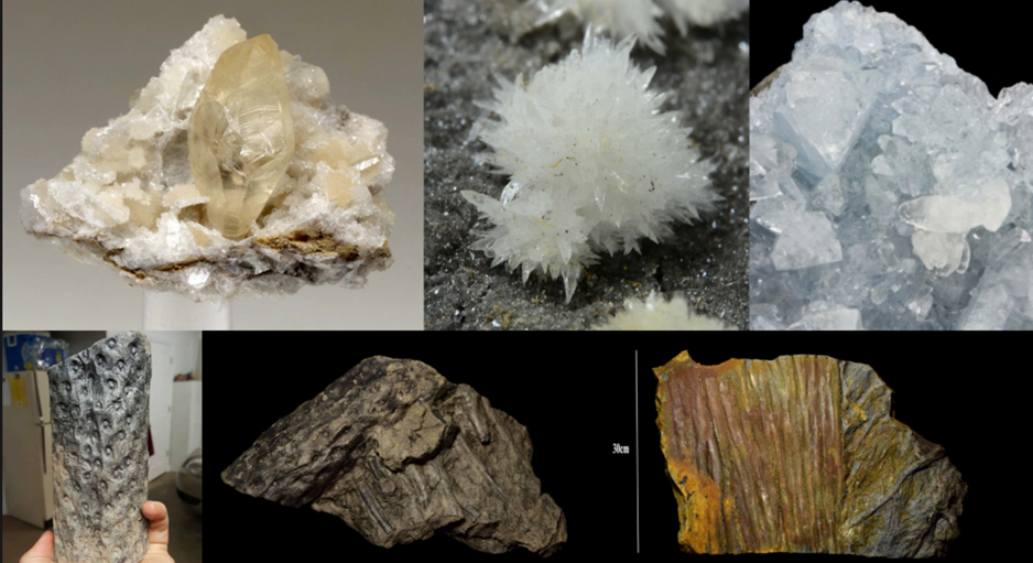 The Appalachian Plateau is famous for coal, gas, oil, and aggregate, but not much in the way of mineral specimens. But nonetheless, Tom provided examples of three minerals. The top row shows calcite, strontianite, and celestine. The bottom row shows three plant fossils, root-related stigmaria and appendage that come out of the roots to further collect water.