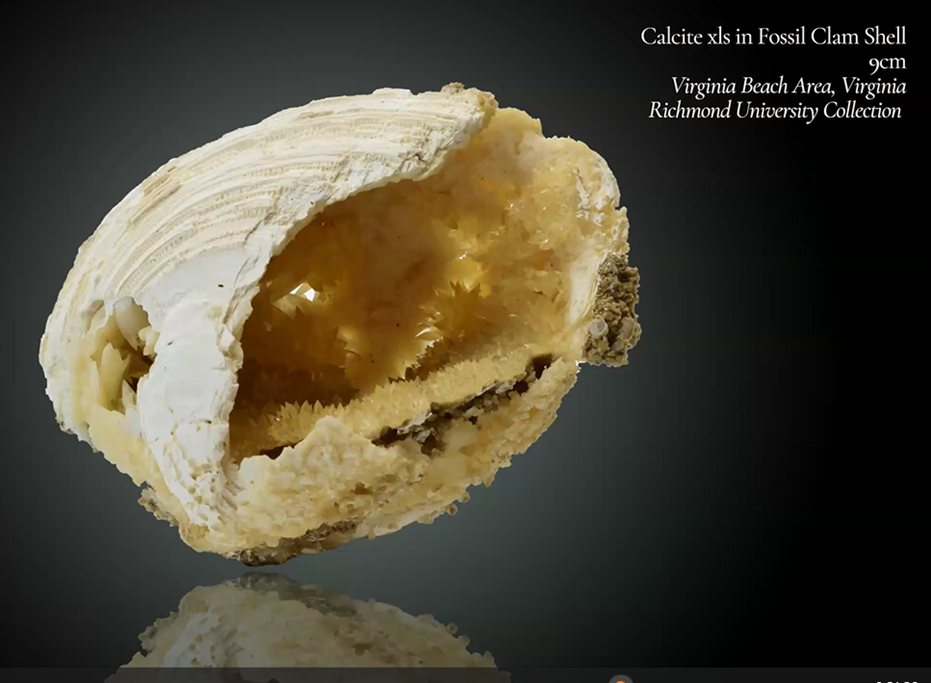 Among the fossils, including the clam shells that are commonly found along the East coast from Florida and extending north beyond the Virginia coast, one can occasionally find tiny calcite crystals which grew within the clam shells as shown below.