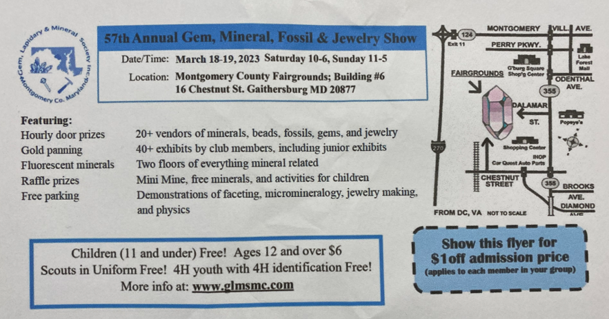 It's not too early to mark your calendar for the 57th Annual Gem, Mineral, Fossil & Jewelry Show on March 18 and March 19. This show, sponsored by the Gem, Lapidary & Mineral Society of Montgomery County, MD (GLMSMC), features over 40 exhibits, door prizes, demonstrations, free specimens for kids, fluorescent minerals, dealers from around the country, and plenty of free parking.