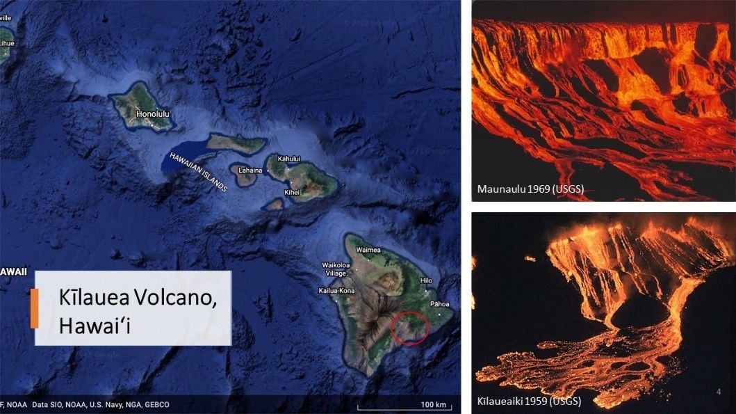 Kilauea is the youngest basaltic shield volcano on the Big Island of Hawaii. It is identified as an effusive volcano, referring to its abundant lava flows. To the right of the above slide are two examples showing the widespread orange-colored lava of the Kilauea Iki eruption of 1959 and the Maunaulu eruption of 1969.