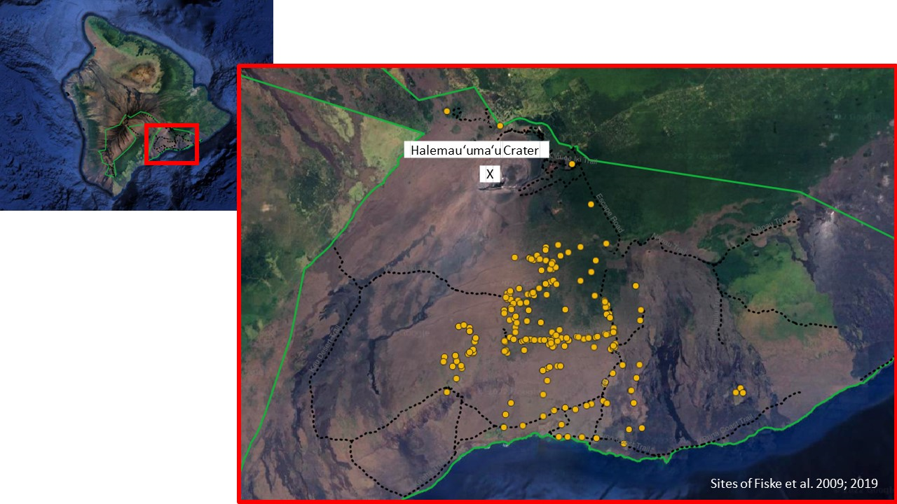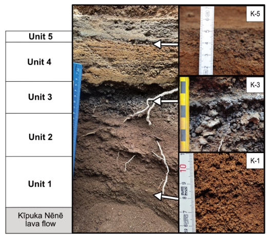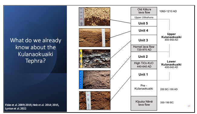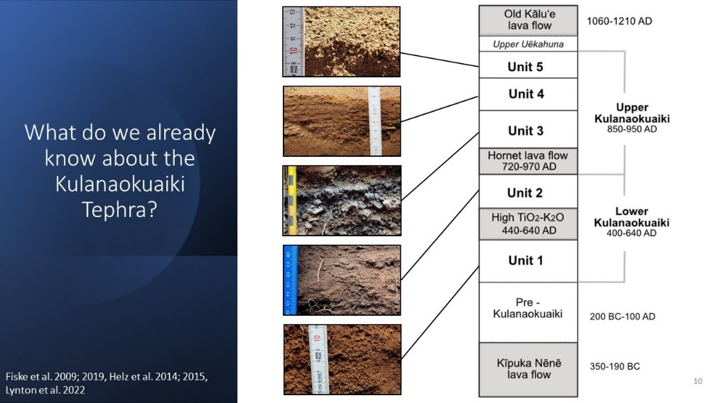 The Kulana tephra on the western and eastern sides of the Kilauea volcano, over the last 1,000 years, was deeply covered by those earlier lava flows. The depositions Abby studied were on the south flank of the Kilauea, deposited there by the trade winds.