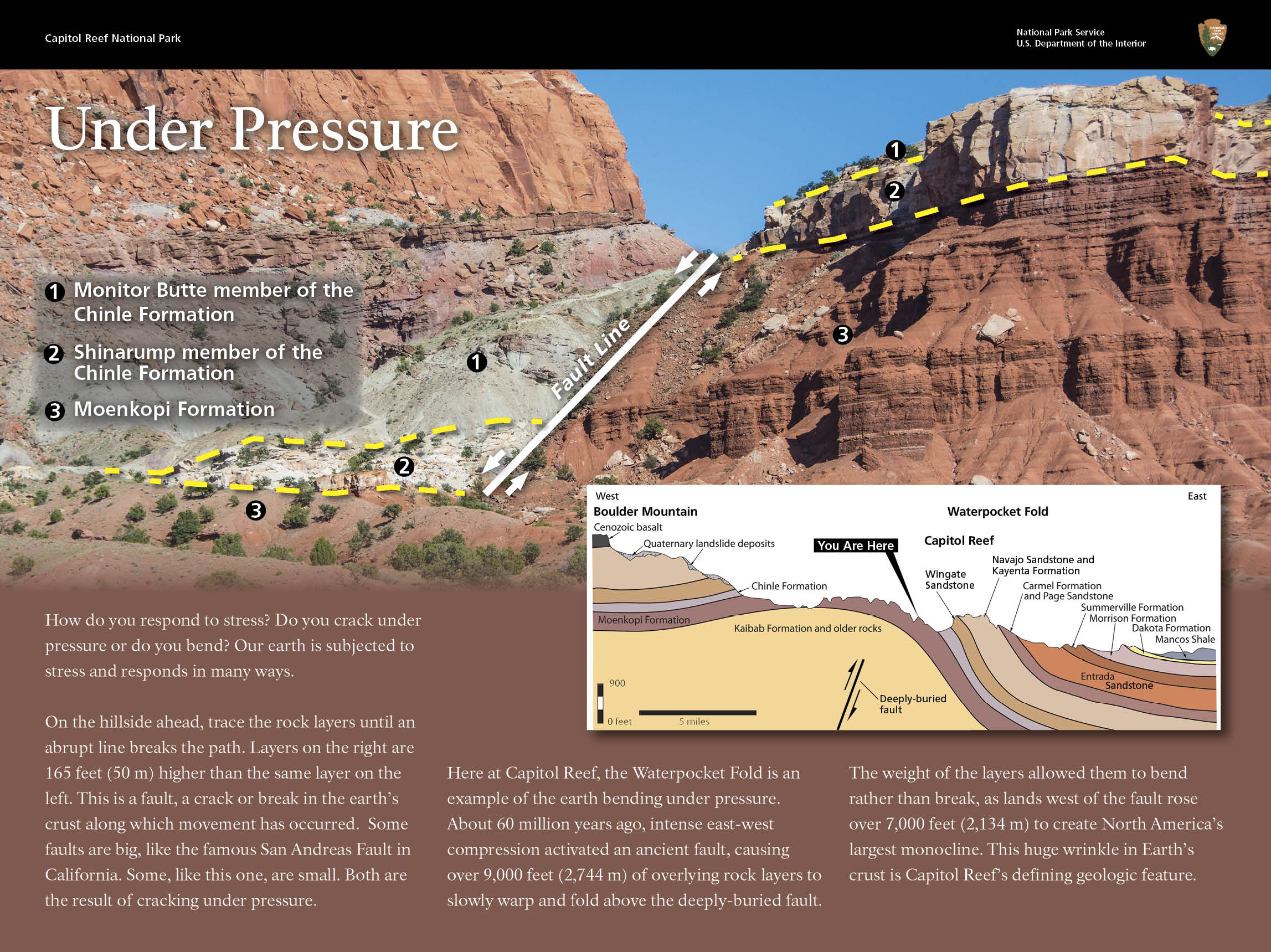 The Waterpocket Fold defines Capitol Reef National Park. A nearly 100-mile long warp in the Earth's crust, the Waterpocket Fold is a classic monocline, a "step-up" in the rock layers. It formed when a major mountain building event in western North America, the Laramide Orogeny, reactivated an ancient buried fault in this region. Movement along the fault caused the west side to shift upwards relative to the east side. The overlying sedimentary layers were draped above the fault and formed a monocline – the longest exposed monocline in North America at nearly 90 miles in length. The rock layers on the west side of the fold have been lifted more than 7,000 feet higher than the layers on the east.
