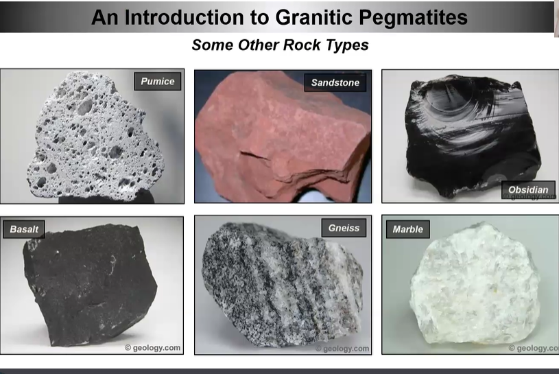 Mike explained that most of the familiar types of rocks have a fine-grained texture. They are simple in that within each of their categories, such as for the six shown above, there is not much variation. “Frankly, compared with pegmatites, they are kind of boring.”