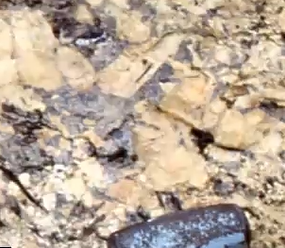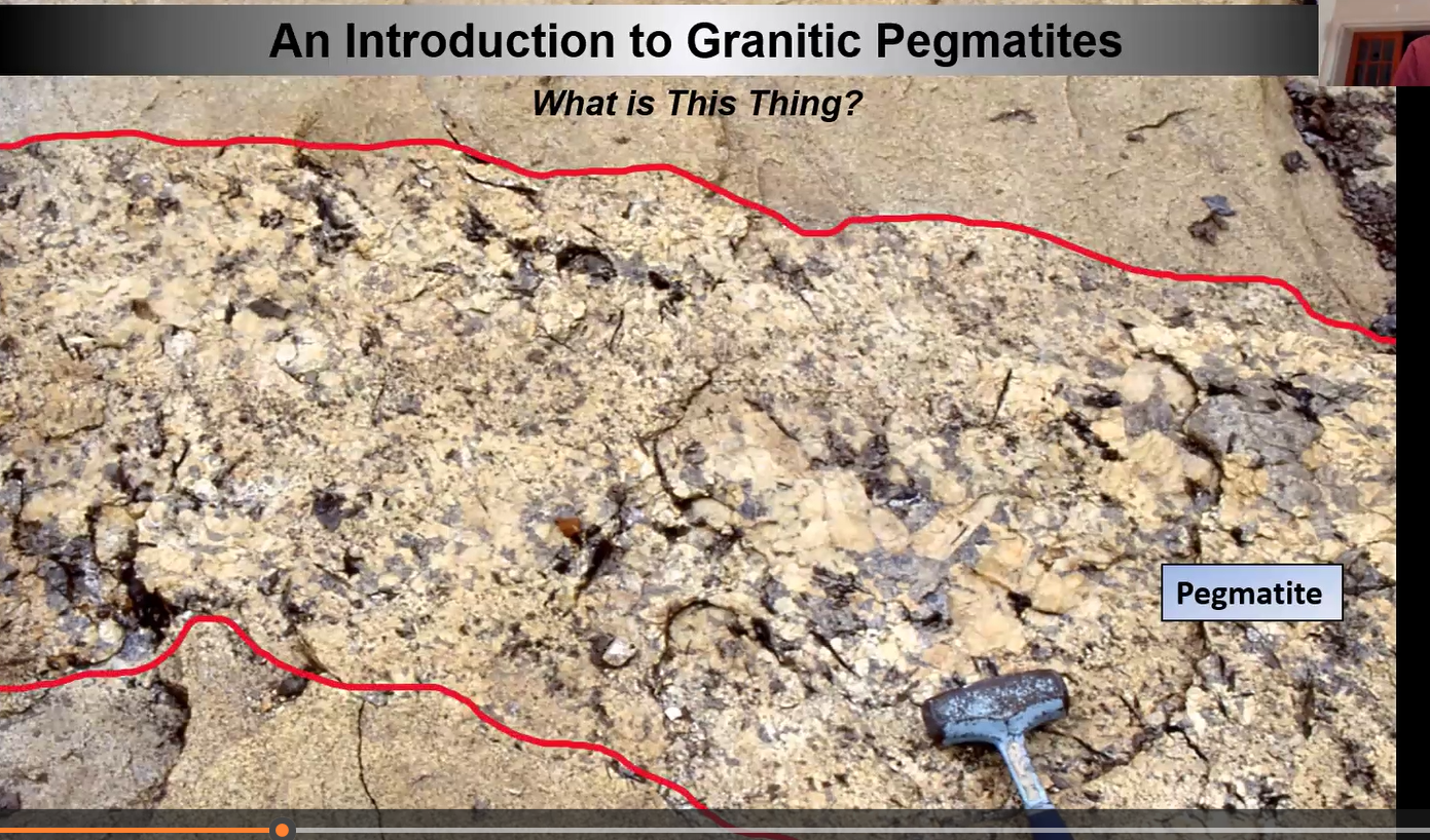 Reader: If you want to know what pegmatite crystals typically look like, listen to Mike’s explanation of the slide below to discover white crystals practically the size of the hammer’s head shown at the bottom. Here’s the link.