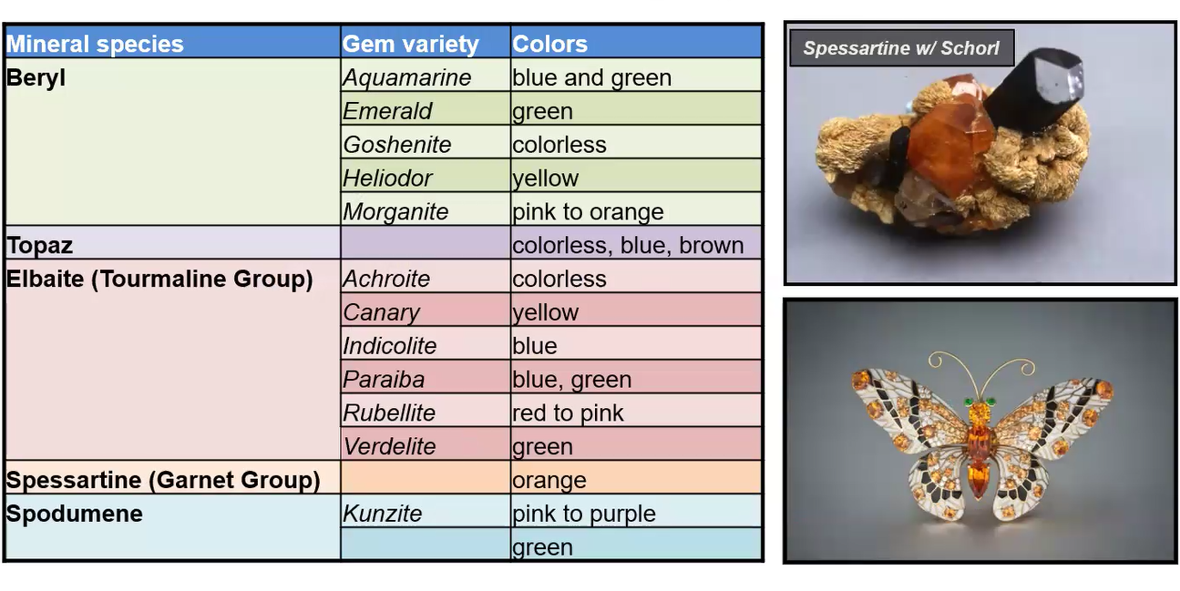 Readers who want to know what gem minerals are found associated with granitic pegmatite can listen to Mike speak about the gem varieties and colors listed below.