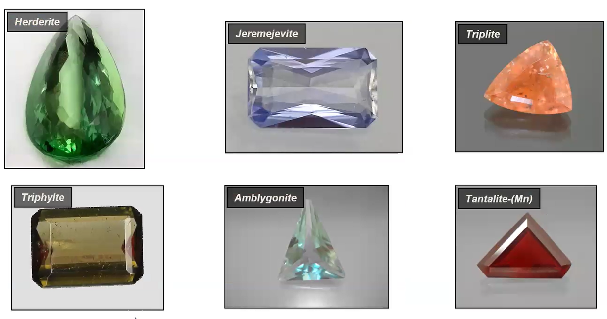 In addition to the more common gemstones listed above, there are also some very rare minerals found within pegmatites that sometimes can be facetted into gemstones, as shown below.