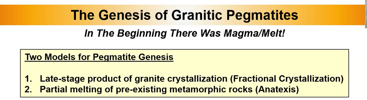 To begin the process “we have to have some molten rock,” which typically is composed of quartz, feldspar, biotite and muscovite granite minerals. But after this commonly agreed upon beginning, geologists belong to one of two camps for models to help explain the genesis of pegmatite.