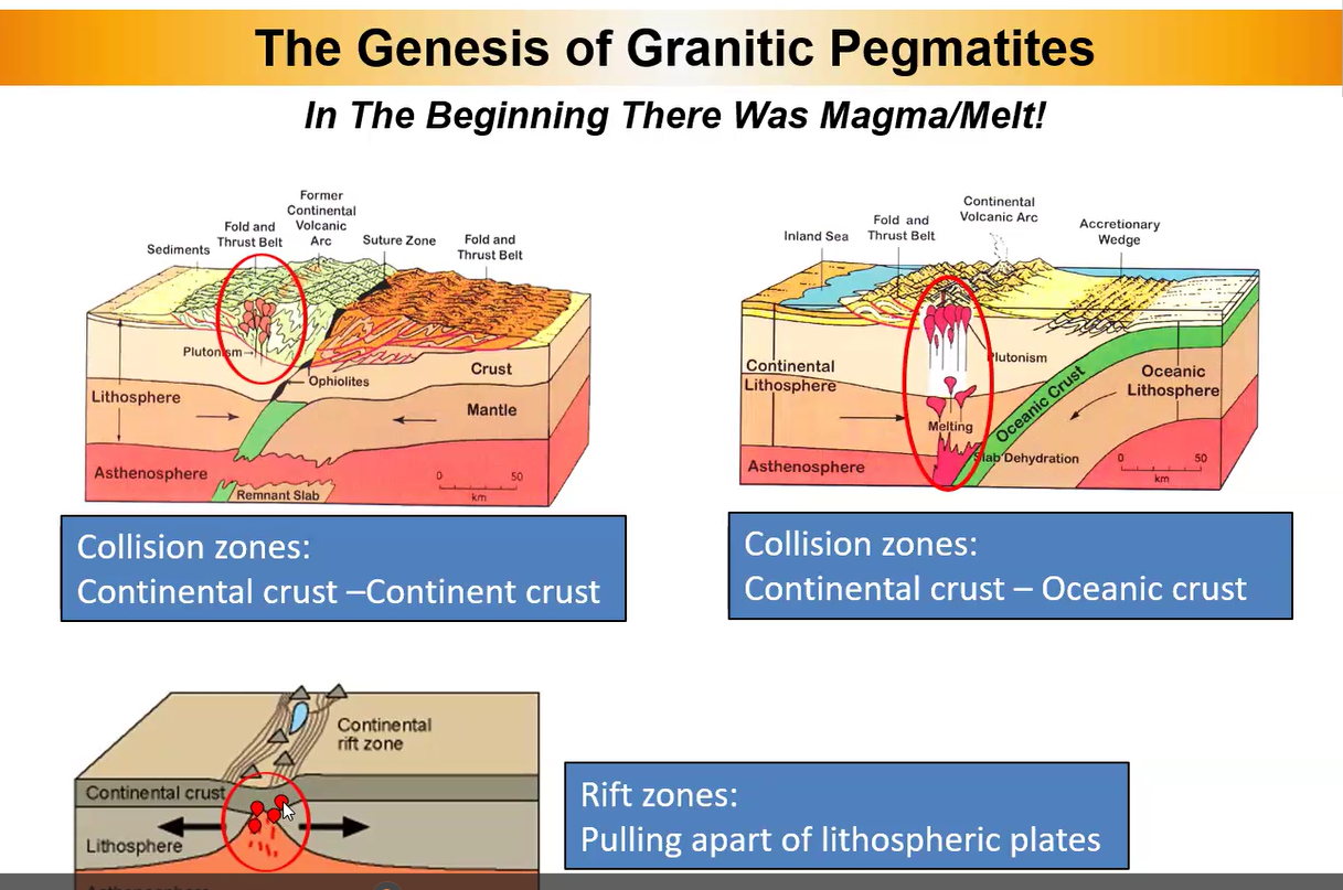 An important variable in this genesis is where in the crust the initial magma melt takes place. Mike explained that for generating the granitic pegmatite there are three major settings, two collision zones and one rift zone as shown below.