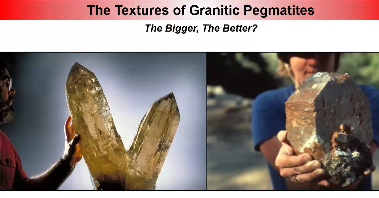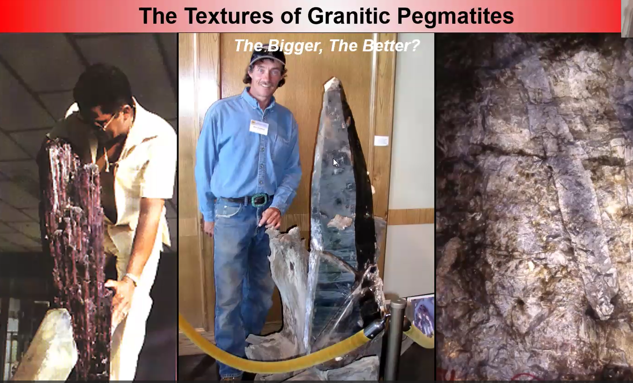 Mike pointed out several important consequences that follow from the melting of the parental granite and the subsequent concentration of the liquid melt. One result is that the growing pegmatite crystals take on a different texture, namely, the crystals become larger. This is the “fun” Mike referred to: large crystals are integral to the definition of pegmatites and “sets them apart from other igneous minerals.” Also, pegmatites have a highly variable texture, or mix of small and large crystals, which is another key characteristic.