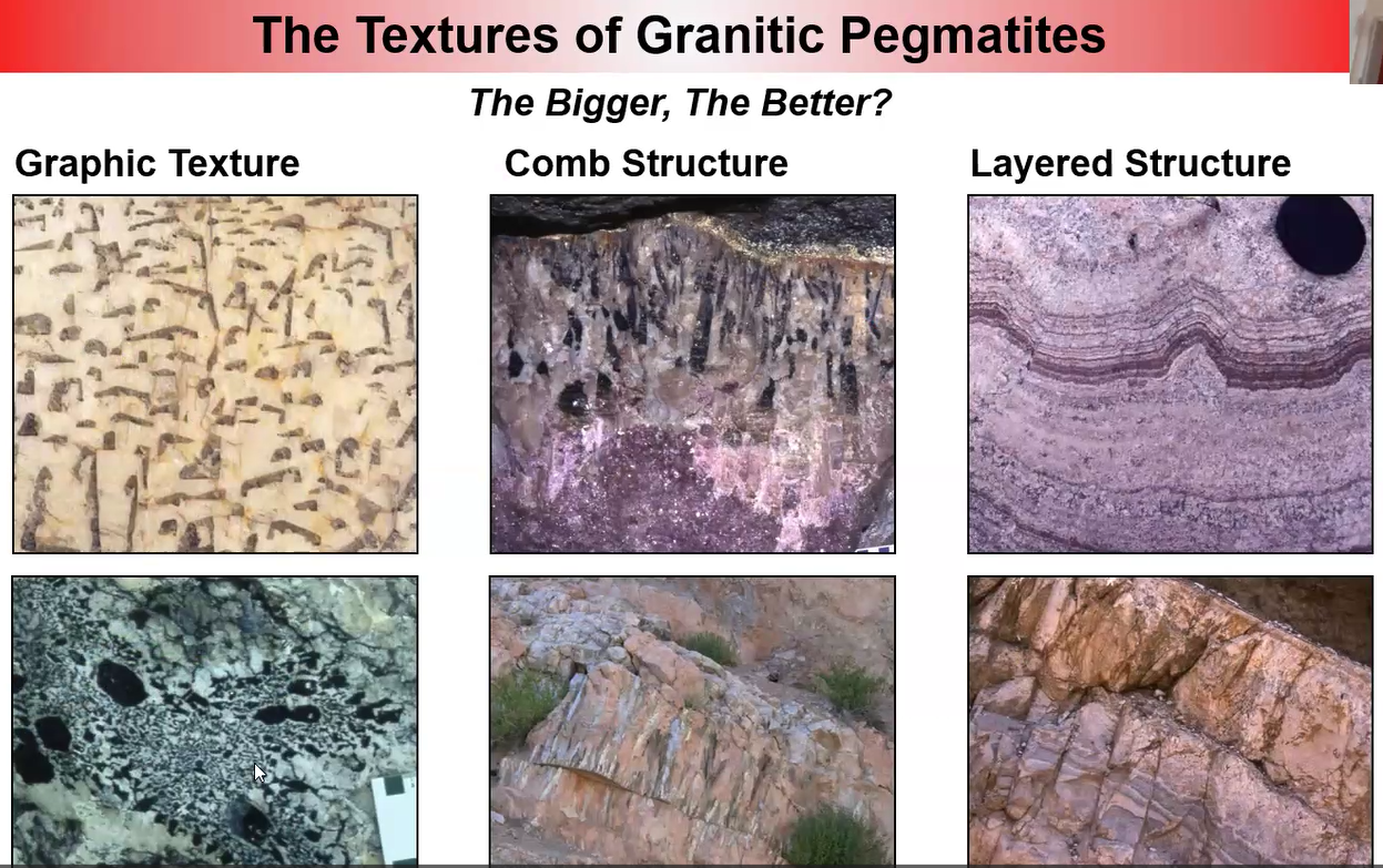 Readers who want to learn about how pegmatites occur in both zoned and unzoned formations, and how within the zoned formation the crystal size increases toward the middle, go to the video. Ditto for those wanting to learn about three variations in the pegmatite textures shown below.