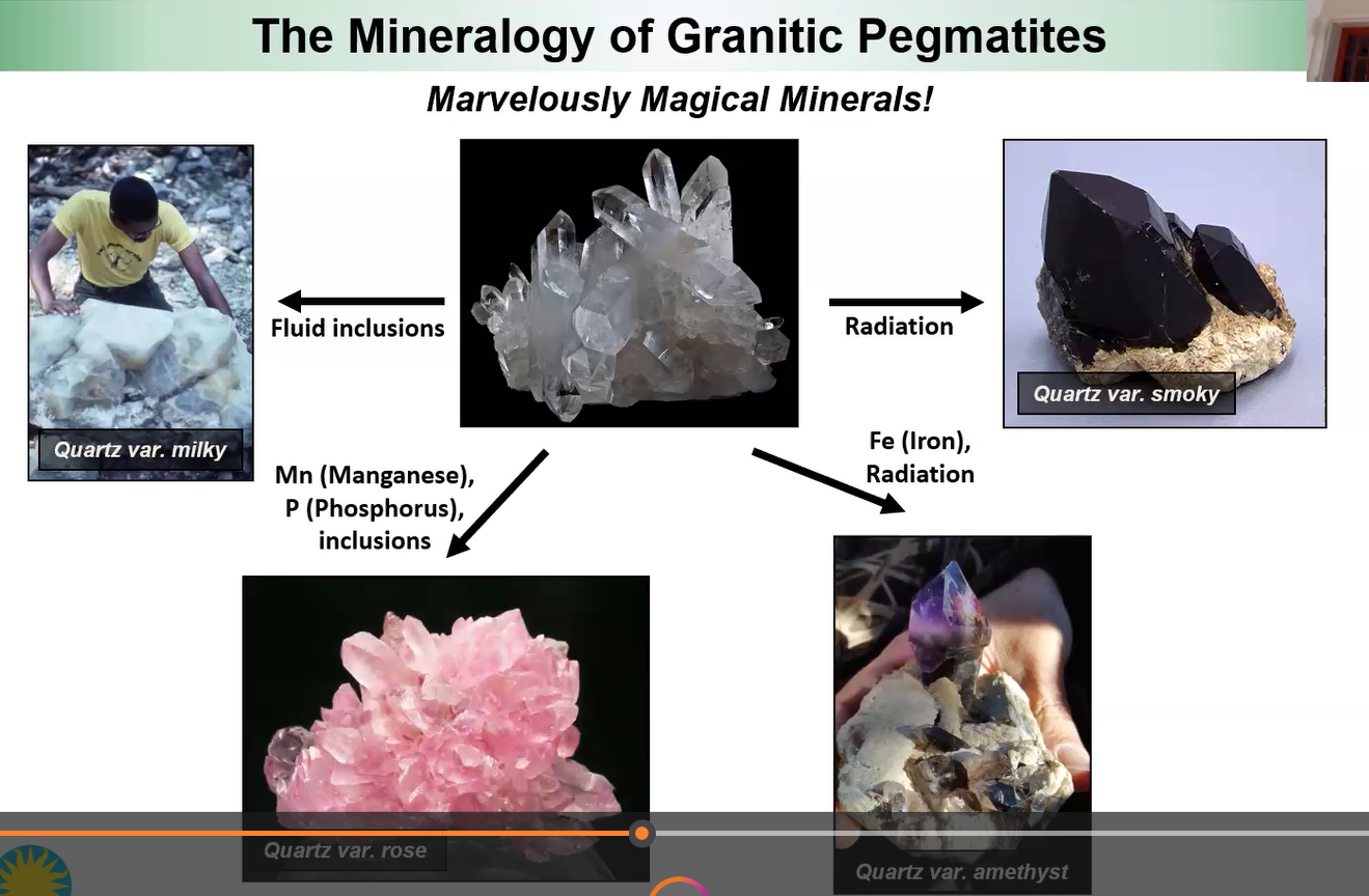 Despite this vast array of elements found in diverse forms of pegmatite as shown above in the “Pegmatite Periodic Table,” some form of quartz (silicon and oxygen) is abundantly present in the majority of pegmatite crystals. The addition of other elements and the effect of environmental factors such as natural radiation can result in many variations in the crystal color, as shown below.