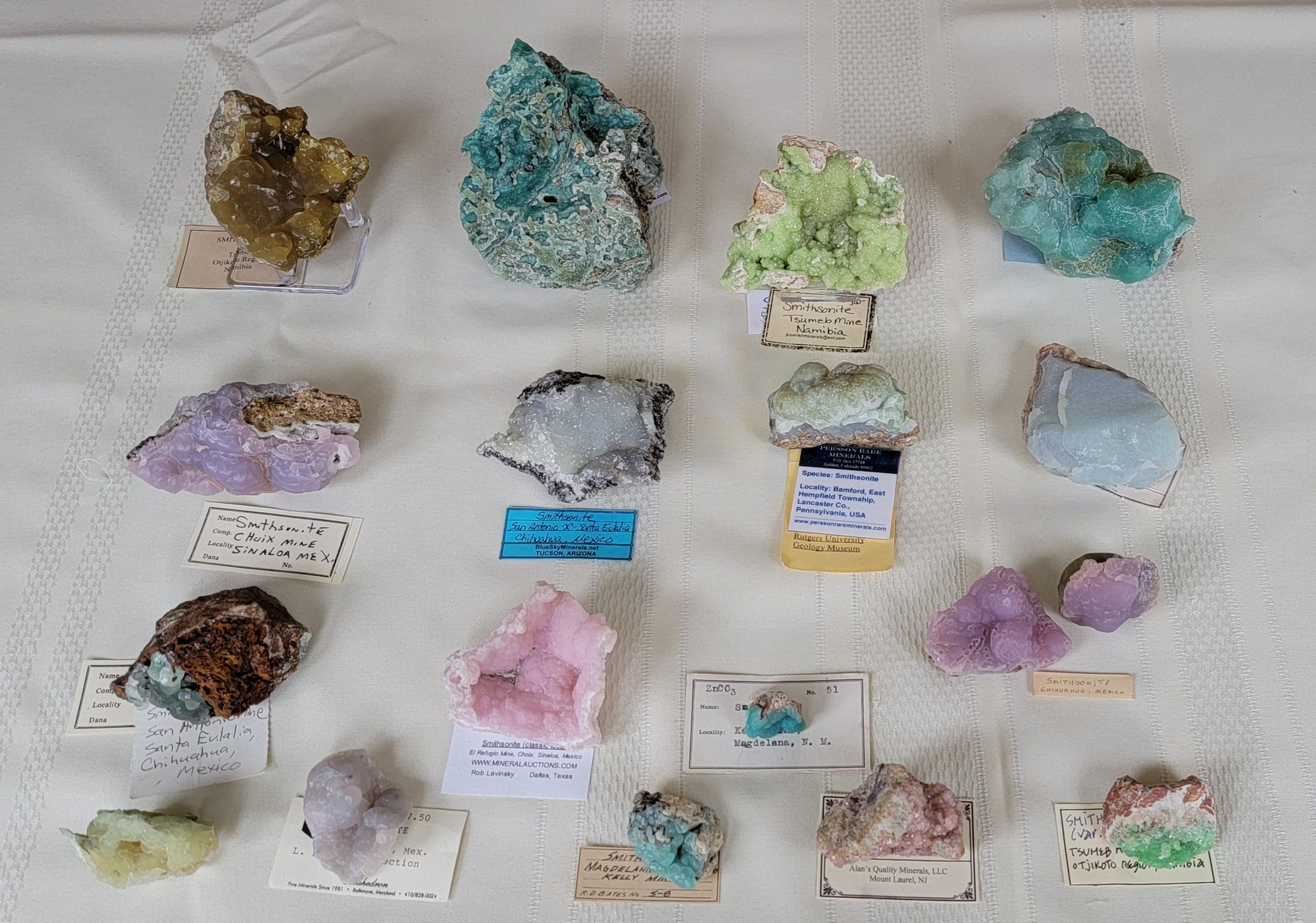 As I sit here writing my Prez Says column, I'm also working on a Smithsonite display for an exhibit at the Gem, Lapidary, and Mineral Society of Montgomery County, MD show at the Montgomery fairgrounds in March. I thought I’d include some pictures of what I have so far.