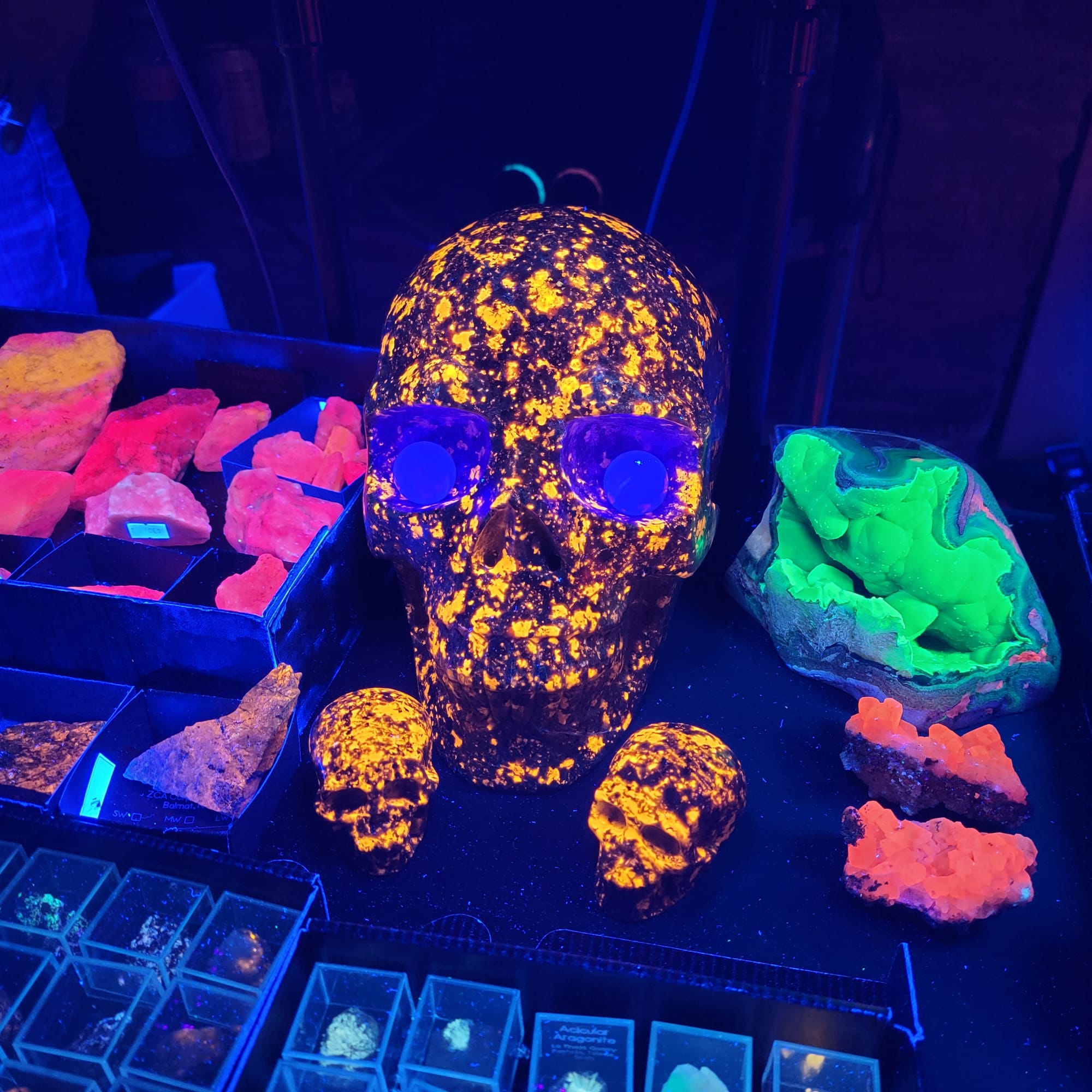 I just returned from a fluorescent mineral show in Fairless Hills, PA, a suburb of Philadelphia. It is one of my favorite mineral shows and I've attended many times. It is the only show I know of that turns the lights out so you can view the vendors’ fluorescent minerals. They turn the lights back on periodically so people can see the minerals in daylight and make purchases. It's a fantastic show and I highly recommend it if you like minerals that glow in the dark!