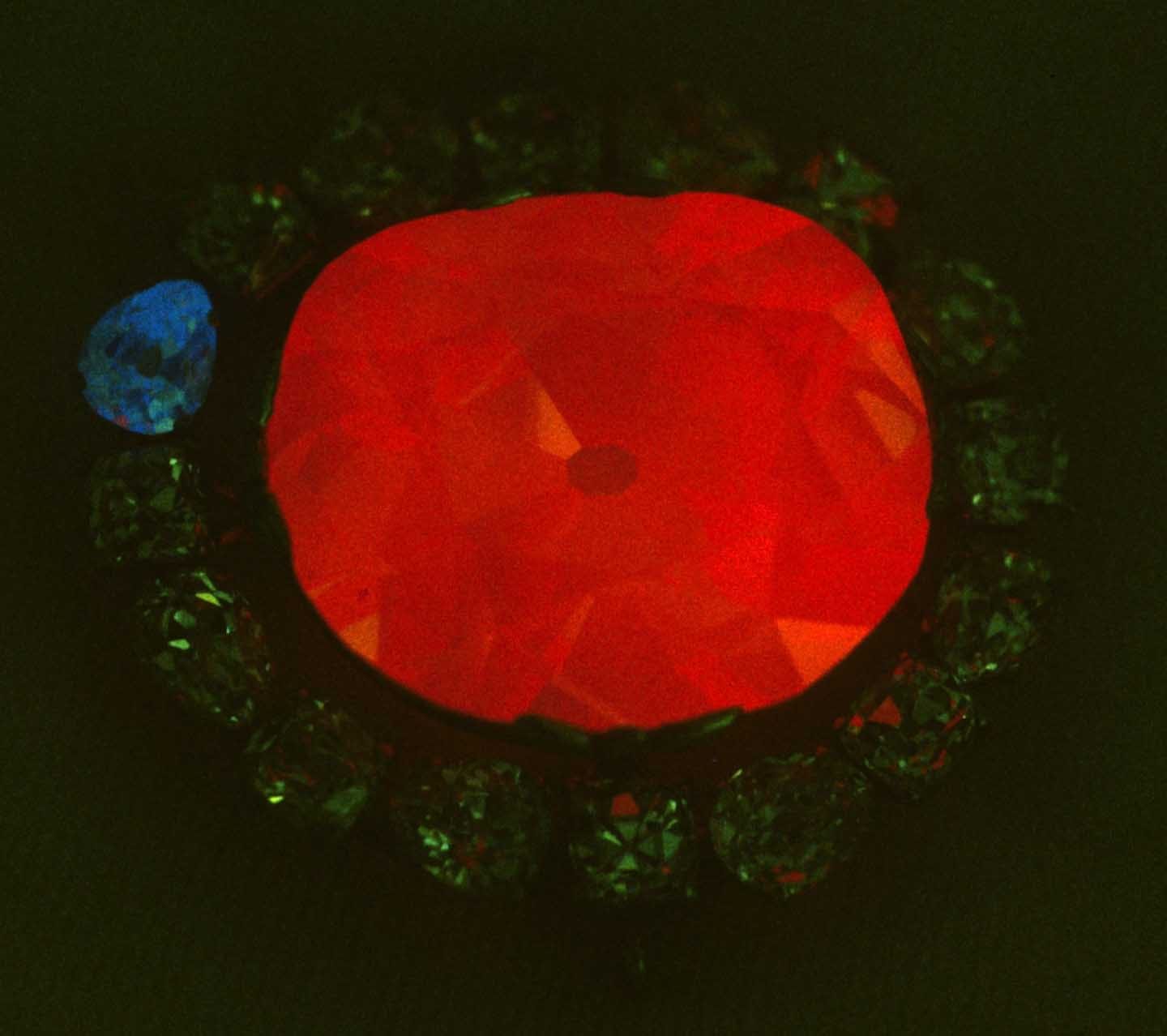 The finished emblem featured a number of spectacular gems, including the French Blue Diamond, the 107-carat Côte de Bretagne spinel (carved into the shape of a dragon and originally thought to be a ruby), and several other diamonds. It was rarely worn, functioning instead as a symbol of the king's power.