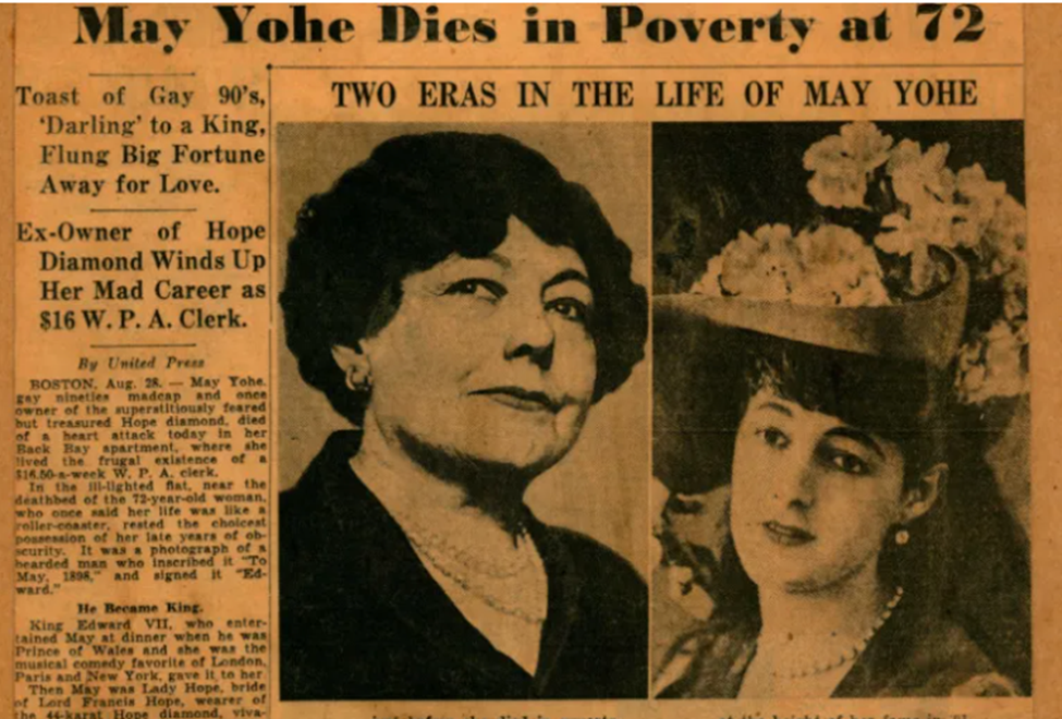 May Yohé, who was once married to Lord Francis Hope, offered her own account of the curse in a book and film released in 1921. In addition to sensationalizing other accounts of misfortune, she claimed the Hope Diamond was the cause of her failed marriage and the loss of the Hope family fortune. Pieces of her elaborate tale were picked up by newspapers, helping establish the curse of the Hope Diamond as a popular modern legend.