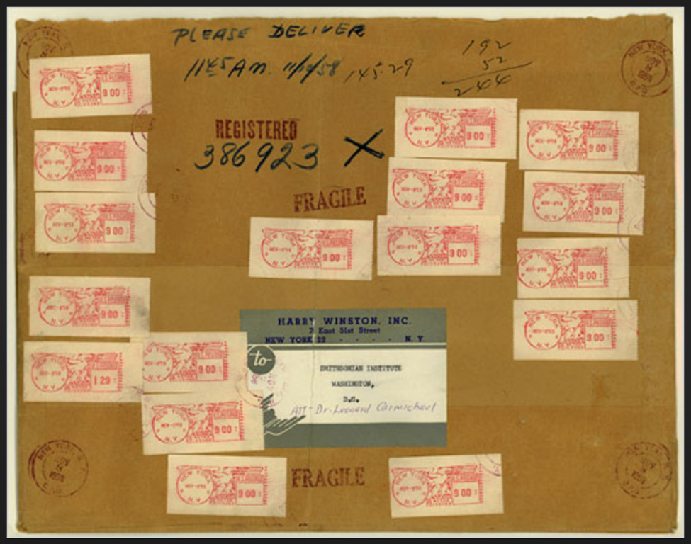 Packing the necklace for shipment was done by a former New York policeman who worked in Winston's shipping department. The necklace was placed in a rectangular black suede case, then swathed in tissue. This all went into a white cardboard box which was then wrapped in brown paper and sealed with gummed tape. Winston's label was affixed and the package addressed to "Smithsonian Institution, Washington, DC. Attention: Dr. Leonard Carmichael, Secretary of the Smithsonian." The package weighed three pounds, thirteen ounces, but most of this was packaging, since the diamond without its companion diamonds weighed just over one-third of an ounce.