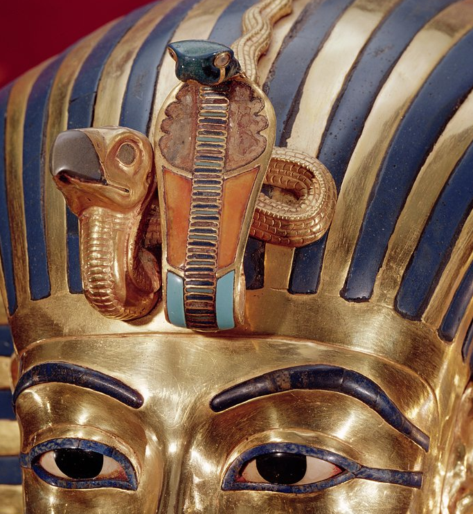 The inlay technique used by Egyptian goldsmiths was extraordinary for its time. Lapidary work involved cutting, shaping, and polishing semi-precious stones to fit designated recesses. The eyebrows and cosmetic outlines on the mask were inlaid with lapis lazuli, secured with an adhesive (likely natural resin or beeswax), and surrounded by thin gold borders. The narrow gold cells formed to receive precisely cut stone fragments were polished flush with the surrounding metal. Microscopic examination of comparable artifacts shows a high degree of fit, indicating careful lapidary work and the use of abrasives such as quartz sand. Glass, carnelian, and turquoise were similarly prepared and set into the mask’s surface. The king’s eyes are reproduced with quartz and obsidian.