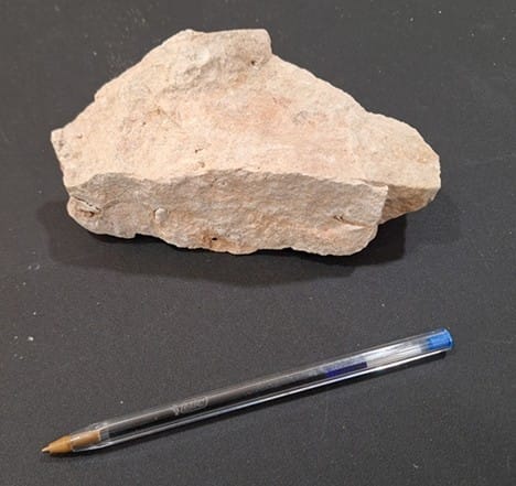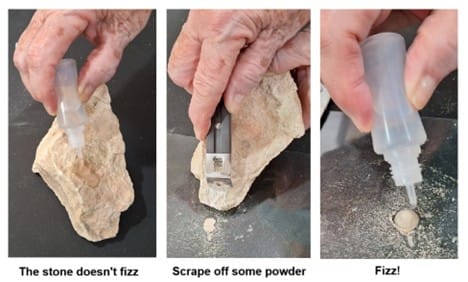 Dolomite is also significantly less chemically active than limestone. When a geologist (or one of my kids at the library rock club) drips acid on calcite limestone, it fizzes. When she or he drips acid on dolostone, there is no noticeable reaction. Scrape the dolostone to produce a little pile of powder, drip acid on the pile; it fizzes, but you must powder it to get the fizz.