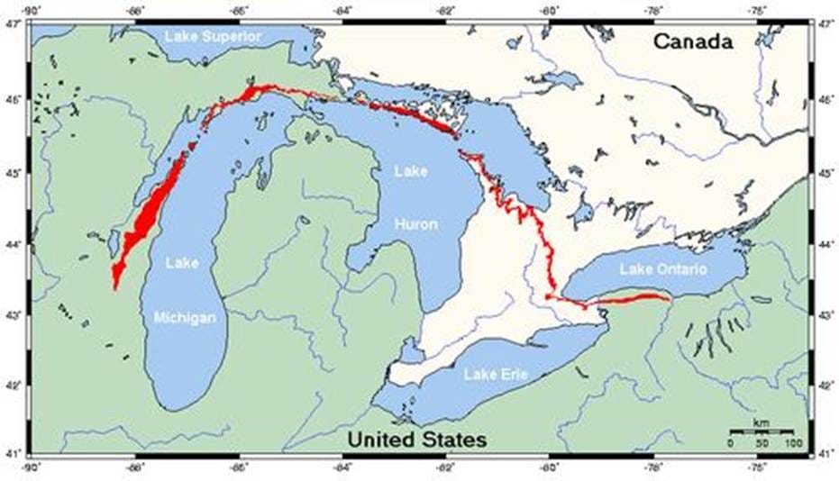 The escarpment is a ridge of dolomitic limestone that stretches from east of Niagara Falls, across the top of Lake Huron and down into the middle of Wisconsin. It’s best known in this country for two places: Niagara Falls, and the thumb of Wisconsin.