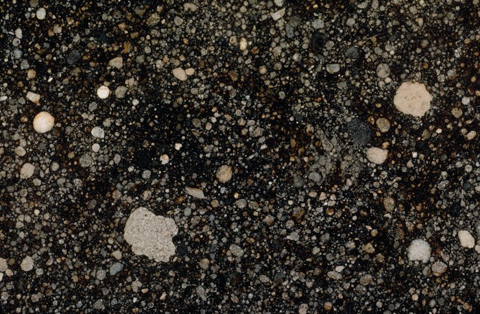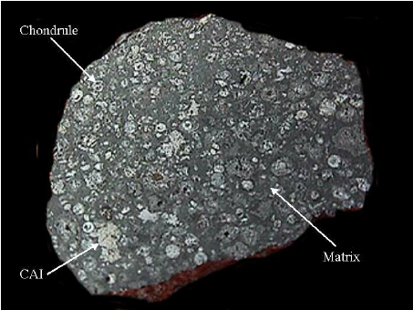 Also seen are white inclusions, up to several centimeters in size, ranging in shape from spherical to highly irregular. These are known as calcium-aluminum-rich inclusions, or "CAIs," so named because they are dominantly composed of calcium- and aluminum-rich silicate and oxide minerals. Both the chondrules and the CAIs formed during rapid heating events at the dawn of the solar system.