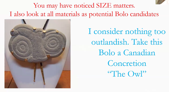 Jim said a number of the bolos he made were created at the request of mineral collectors who asked him to make them as gifts for family and friends. As with all artistic creations, artists have to work with the size and weight limitations of the media. As shown below, despite its two-pound weight, the heavy but whimsical Canadian concretion was a favorite of some of Jim’s MSDC audience.
