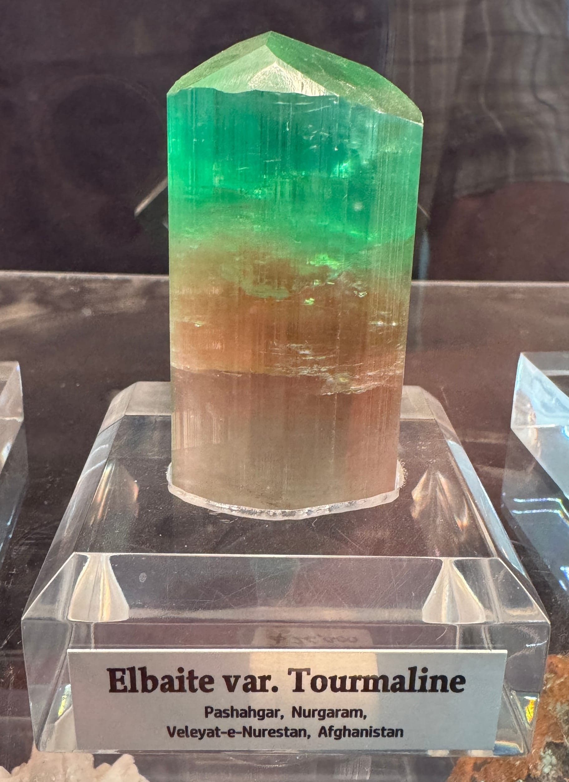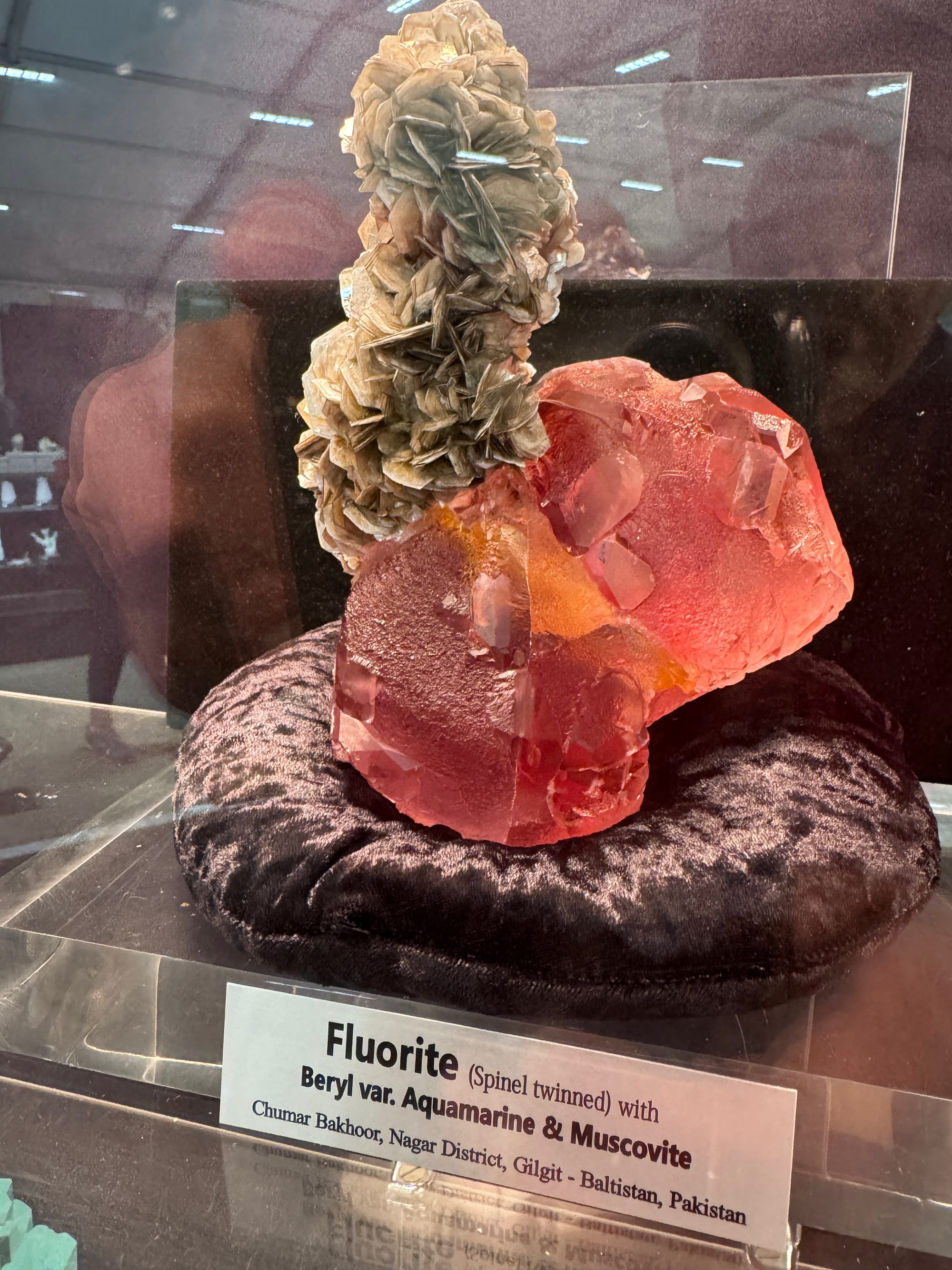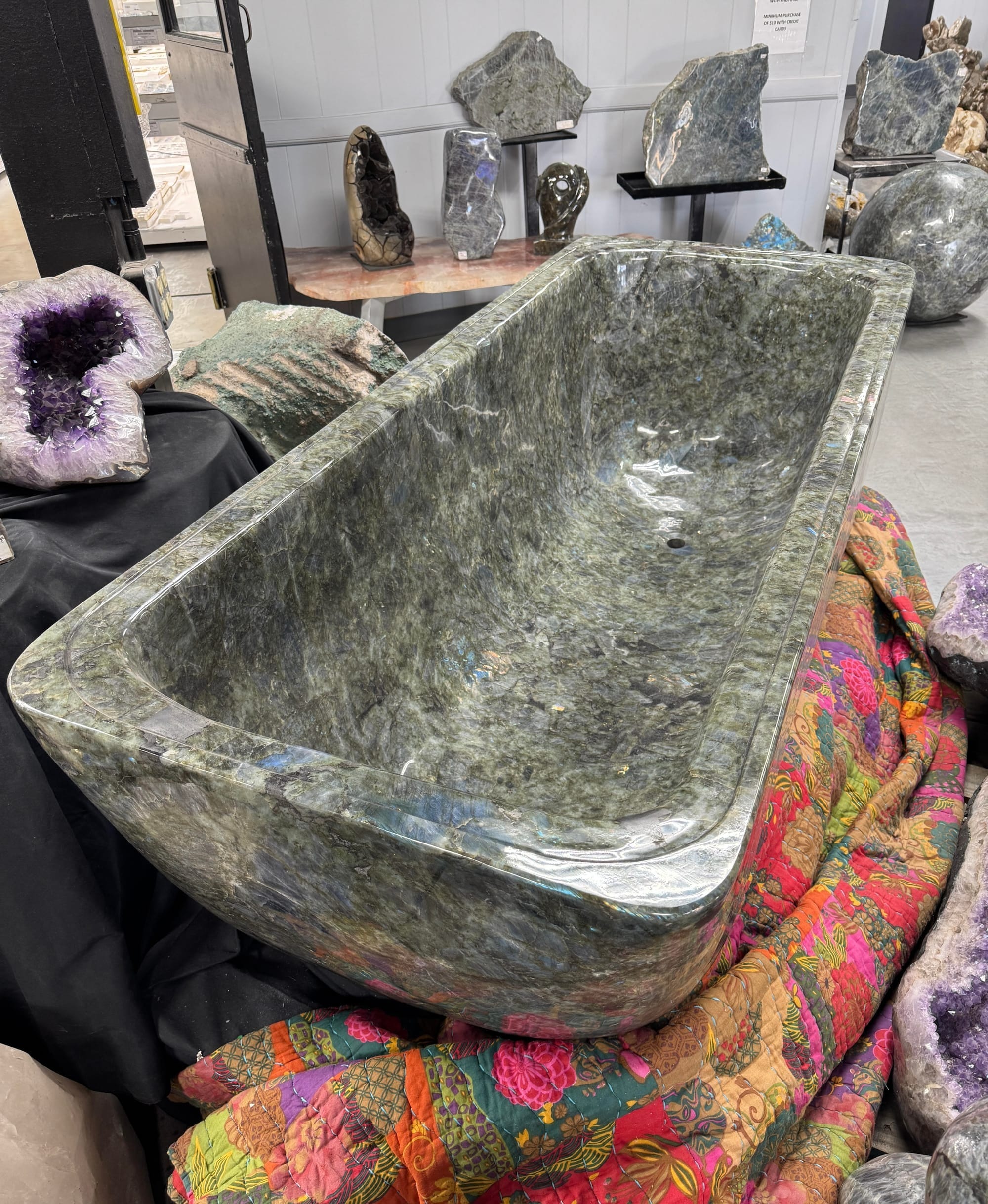 The fabulous specimen was for sale by the Focal Crystal, $16.5K.Ken Rock and Marshall Sussman, Tsumeb expert and mineral dealer. I reconnected with Marshall shortly after I arrived in Tucson and it was a highlight of my Tucson experience.This exceptional specimen was sold at the show by the Rocksaholics, Arif and Aisha Jan. Aisha said that this fluorite is the best in the world from Chumar Bakhoor, Nagar, Pakistan, adding that it is 100% natural, with zero repairs, treatment, or restoration. Vanadinite on barite, Mibladen, Khenifra Province, Morocco. For sale by Unique Minerals, Inc. $15K.According to Arkenstone Minerals, this specimen shows "A color combo worth treasuring - purple amethyst with salmony, orangey red calcite from Brazil."Gary Roskin, Publisher of the Roskin Gem News Report, and Ken Rock at the GJX Gem Show holding specimens of Paraiba tourmaline. The blue color comes from trace amounts of copper in the crystal structure.Elbaite variety tourmaline "Rocketship," Aricanga Mine, Sao Jose da Safira, Minas Gerais, Brazil for sale by Crystal Classics, $17.5K.This remarkable polished face of rhodochrosite is from the Inakuraishi Mine, Aomori, Japan. It was purchased by Gene Meieran in Japan in the 1970's while he was on travel for Intel. It is for sale by The Arkenstone, $75K. Malachite from the Star of the Congo Mine, Katanga, Democratic Republic of Congo. Available at the Arkenstone, $120K.Note the lovely "grape jelly" color of this specimen.Many different forms of malachite. Most (or all) are from the Democratic Republic of Congo.This wonderful, gemmy, good-sized, lustrous pink octahedral specimen of spinel is from the Mogok Township in the Mandalay Region of Myanmar. The crystal formed in a marble matrix. One the left is an accompanying negative "cast" specimen of marble showing how the crystal was formed. For sale by Brian Kosar Mineral Classics for $16K. Three fine tourmaline specimens.One of several cases at the Convention Center show dedicated to Gene Meieran, collector, philanthropist, friend, and overall great guy. The case features a timeline of Gene's life, some of his many awards, and some extraordinary mineral specimens from his collection.Kathy Hrechka, MSDC member and Editor and Historian for The Micromineralogists of the National Capital Area.Past MSDC President Dave Nanney, Leslie Nanney, and Ken Rock at the Convention Center show.This bathtub is made entirely from labradorite from Madagascar. Ready for your next bathroom remodel.