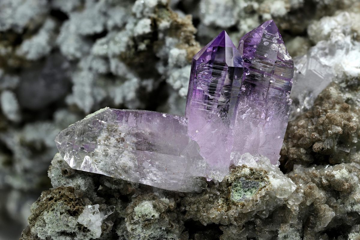 Amethysts from the Veracruz region are “classics in the marketplace because of their aesthetics. They are highly lustrous, have a wide range of color, often have a lot of the matrix rock, and have microcrystal epidote [a greenish mineral that grows alongside the amethyst],” says Steve Behling, a broker with Collector’s Edge Minerals Inc. The purple coloration is due to irradiation and the presence of iron and other elements as the crystal formed, with many crystals growing together in sprouting or artichoke formations. (More specifically, “These crystals are formed in vesicular andesite, volcanic vugs [cavities] with amethyst quartz, calcite, epidote, and various zeolites,” according to another dealer.)